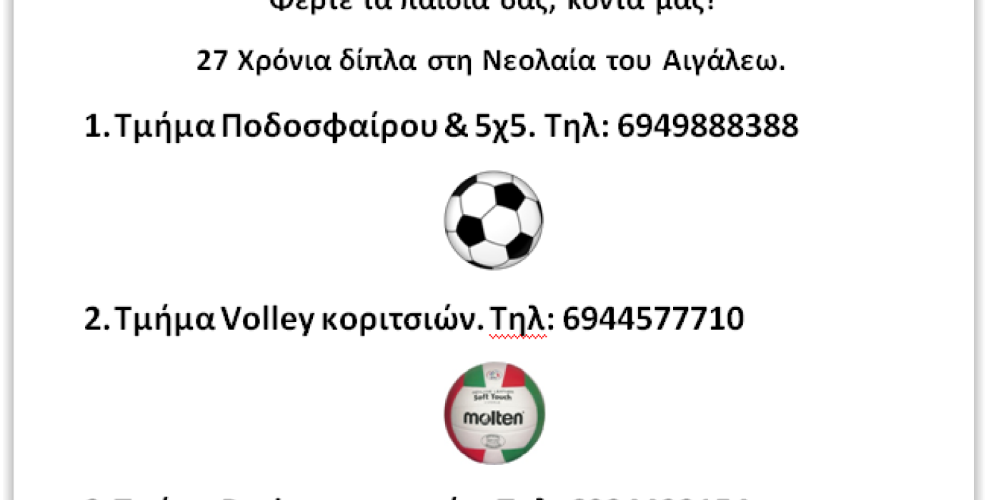 Ανακοίνωση για όλους τους γονείς & μικρούς, νέους αθλητές Φεβρουάριος 6, 2014 - 09:09 Φέρτε τα παιδιά σας, κοντά μας. 28 Χρόνια δίπλα στη Νεολαία του ΑιγάλεωΛειτουργούν τμήματα: Basket Αγοριών & Κοριτσιών, Βόλλευ Κοριτσιών, Ποδόσφαιρο 5χ5. TAGS: #Σύλλογος Τελευταία Νεα ΚΟΠΗ ΤΗς ΠΙΤΑΣ ΤΟΥ Μ.Ε.Λ.Α.Σ. ο ΑΓΙΟΣ ΕΛΕΥΘΕΡΙΟΣ , Φεβρ 2025 ΚΟΠΗ ΤΗς ΠΙΤΑΣ ΤΟΥ Μ.Ε.Λ.Α.Σ. ο ΑΓΙΟΣ ΕΛΕΥΘΕΡΙΟΣ , Φεβρ 2025 Συμμετέχουμε στη πορεία διαμαρτυρίας για τα Τέμπη Συμμετέχουμε στη πορεία διαμαρτυρίας για τα Τέμπη Πρόσκληση Γενικής Συνέλευσης του Μ.Ε.Λ.Α.Σ. ο Άγιος Ελευθέριος Πρόσκληση Γενικής Συνέλευσης του Μ.Ε.Λ.Α.Σ. ο Άγιος Ελευθέριος Κοπή πίτας 2025, του Μ.Ε.Λ.Α.Σ. Άγιος Ελευθέριος Κοπή πίτας 2025, του Μ.Ε.Λ.Α.Σ. Άγιος Ελευθέριος Promitheas Park Tournaments "Ανδρέας Μελιγδής" Promitheas Park Tournaments "Ανδρέας Μελιγδής" Χρόνια Πολλά, Καλά Χριστούγεννα & Καλή Πρωτοχρονιά Χρόνια Πολλά, Καλά Χριστούγεννα & Καλή Πρωτοχρονιά Πρωτάθλημα Γυναικών Β΄ Κατηγορίας ΕΣΚΑ, 12η Αγωνιστική Πρωτάθλημα Γυναικών Β΄ Κατηγορίας ΕΣΚΑ, 12η Αγωνιστική Πρωτάθλημα Νεανίδων Β΄ Κατηγορίας ΕΣΚΑ, 12η Αγωνιστική Πρωτάθλημα Νεανίδων Β΄ Κατηγορίας ΕΣΚΑ, 12η Αγωνιστική Πρωτάθλημα Κορασίδων Α΄ Κατηγορίας ΕΣΚΑ, 12η Αγωνιστική Πρωτάθλημα Κορασίδων Α΄ Κατηγορίας ΕΣΚΑ, 12η Αγωνιστική Πρωτάθλημα Γυναικών Β΄ Κατηγορίας ΕΣΚΑ, 11η Αγωνιστική Πρωτάθλημα Γυναικών Β΄ Κατηγορίας ΕΣΚΑ, 11η Αγωνιστική