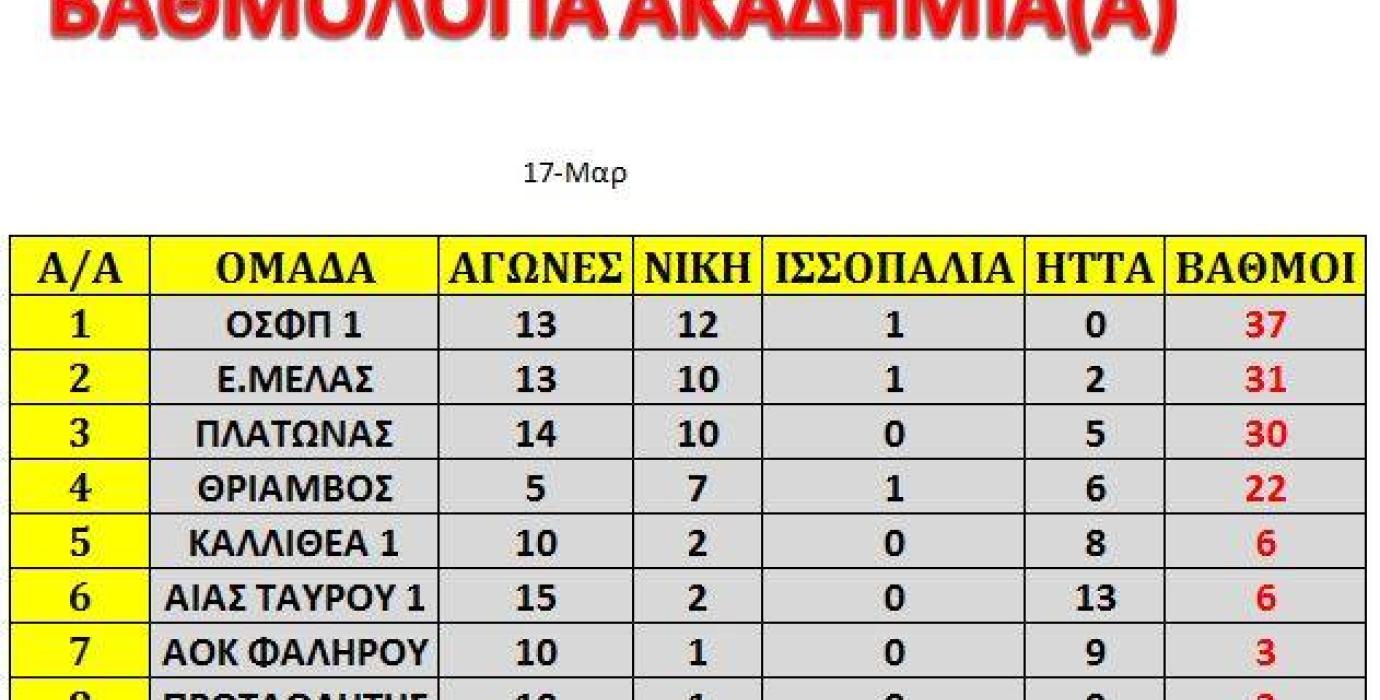 H ομάδα των Ακαδημιών βρίσκεται στη 2η θέση πίσω από τον Ολυμπιακό (1ος με 37 Βαθμούς), με απολογισμό 10 Νίκες 1 Ισοπαλία 2 Ήττες και 31 Βαθμούς