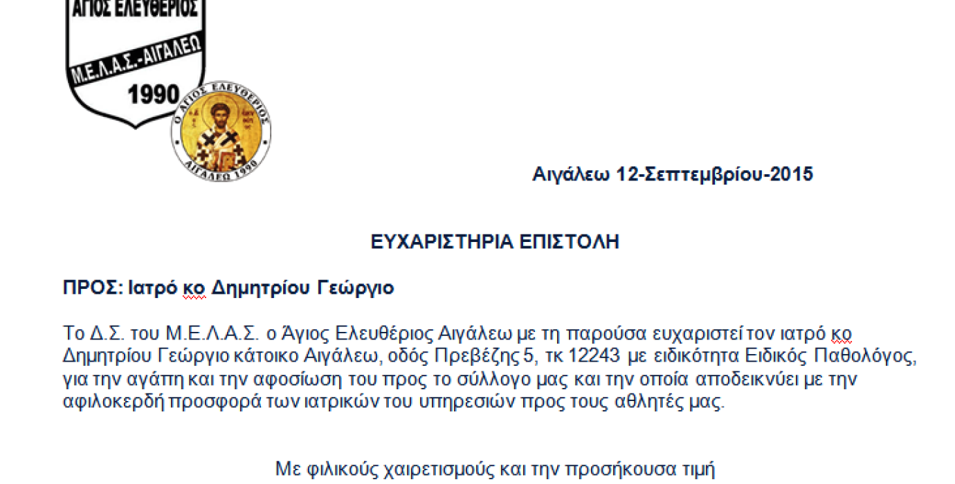 Το Δ.Σ. του Μ.Ε.Λ.Α.Σ. ο Άγιος Ελευθέριος Αιγάλεω με τη παρούσα ευχαριστεί τον Ιατρό κο Δημητρίου Γεώργιο κάτοικο Αιγάλεω, οδός Πρεβέζης 5, τκ 12243 με ειδικότητα Ειδικός Παθολόγος,