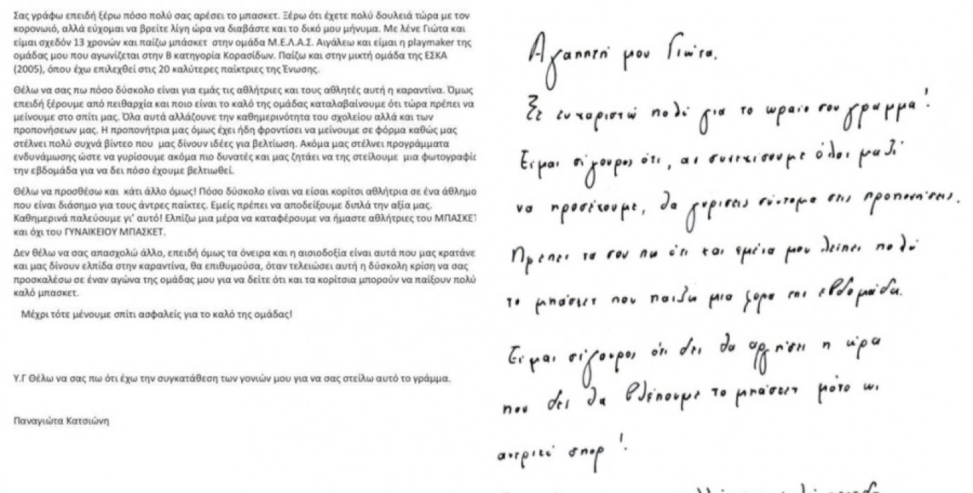 Το γράμμα της Παναγιώτας δεν έμεινε αναπάντητο, καθώς ο ίδιος ο πρωθυπουργός της έστειλε ιδιόχειρη απάντηση εκφράζοντας τόσο την αισιοδοξία ότι αν συνεχίσουμε να προσέχουμε η επιστροφή στα παρκέ δεν θα αργήσει, όσο και την πεποίθηση του ότι θα ανταμώσουμε ξανά στα γήπεδα που τόσο αγαπάμε.