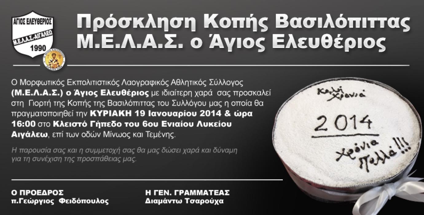 Ο Μορφωτικός Εκπολιτιστικός Λαογραφικός Αθλητικός Σύλλογος (Μ.Ε.Λ.Α.Σ.) ο Άγιος Ελευθέριος με ιδιαίτερη χαρά σας προσκαλεί στην Γιορτή της Κοπής της Βασιλόπιττας του Συλλόγου μας η οποία θα πραγματοποιηθεί την ΚΥΡΙΑΚΗ 19 Ιανουαρίου 2014 & ώρα 16:00 στο Κλειστό γήπεδο του 6ΟΥ Ενιαίου Λυκείου Αιγάλεω, επί των οδών Μίνωος και Τεμένης.