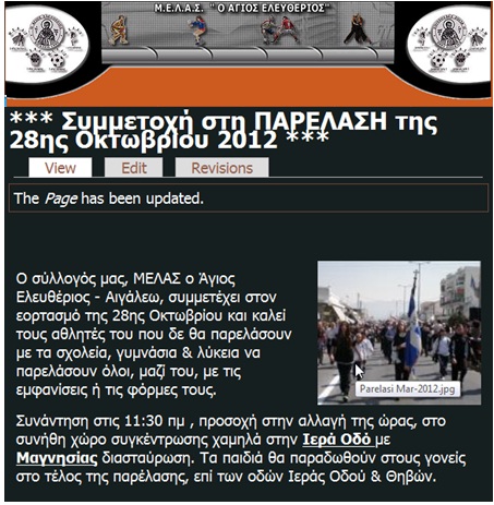 Ο σύλλογός μας, ΜΕΛΑΣ ο Άγιος Ελευθέριος - Αιγάλεω, συμμετέχει στον εορτασμό της 25ης Μαρτίου και καλεί τους αθλητές του που δε θα παρελάσουν με τα σχολεία, γυμνάσια & λύκεια να παρελάσουν όλοι, μαζί του, με τις εμφανίσεις ή τις φόρμες τους.