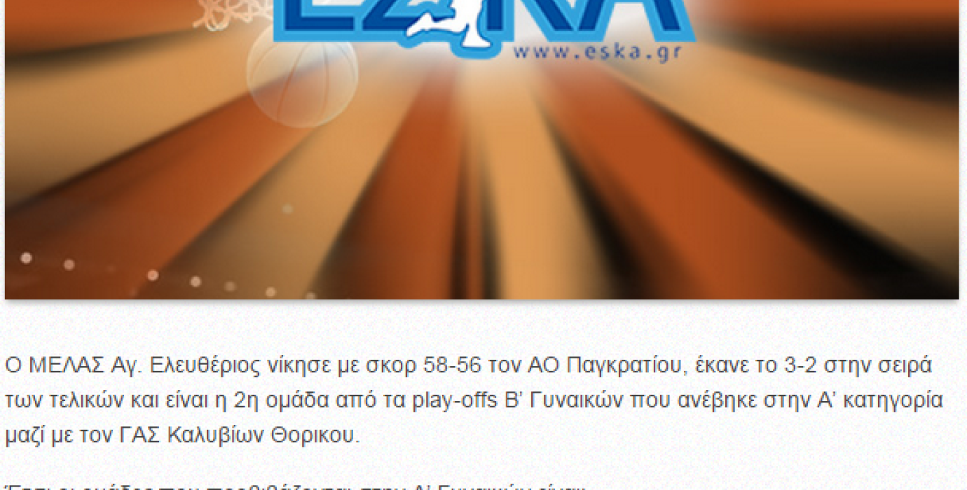 Και ο ΜΕΛΑΣ στην Α' Κατηγορία Γυναικών μετά τη νίκη του επί του Παγκρατίου με σκορ 58-56 σε ένα γήπεδο γεμάτο όχι μόνο κόσμο αλλά και μπασκετόκοσμο που ήρθαν να θαυμάσουν ένα παιχνίδι με πολλές ανατροπές. Με 8 παίκτριες το Παγκράτι και την επιστράτευση της Γαζέτας που ήταν ανήμπορη να βοηθήσει.