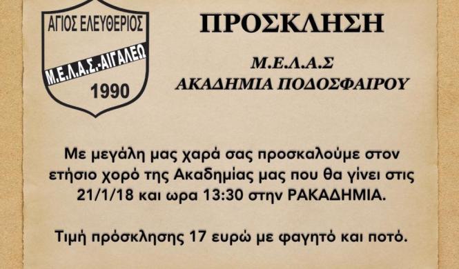 Η Διοίκηση και ο Πρόεδρος του Μ.Ε.Λ.Α.Σ. ο Άγιος Ελευθέριος – Αιγάλεω με ιδιαίτερη χαρά σας προσκαλεί στην Γιορτή της κοπής της Βασιλόπιτας του Συλλόγου μας η οποία θα...